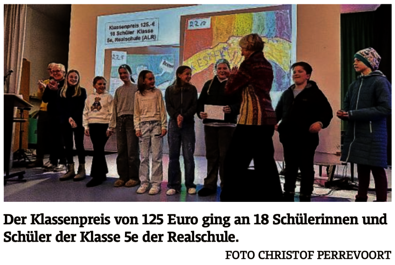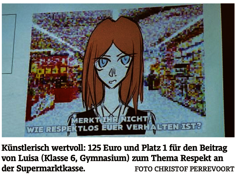 Hermann Ikemann betonte, wie beeindruckt die Organisatoren vom Engagement der Jugendlichen waren. Man habe erfahren wollen, „wie junge Menschen zu der Sache stehen, welche Gedanken sie mit dem Thema Respekt verbinden". Das Ergebnis sei überwältigend: „Über 150 Schülerinnen und Schüler haben teilgenommen und 65 Beiträge eingereicht. Ein tolles Ergebnis." Die Veranstaltung diene der Würdigung aller Beteiligten – ausdrücklich nicht nur der Preisträger. Die Jury war besonders beeindruckt von der Vielfalt der Beiträge: Respekt im Alltag, Respekt im Straßenverkehr, Respekt im Miteinander. Das Preisgeld von insgesamt 1500 Euro wurde aufgeteilt in Videopreise, Gruppenpreise, einen Klassenpreis und zum Beispiel einen Sonderpreis in Höhe von 250 Euro für eine Bildcollage, die die Kunst-AG (Klassen 5 bis 10) der Realschule ablieferte. Thema: „Respekt hat viele Gesichter". Ein Einzelpreis ging an Lotta Ferling vom Joseph-König-Gymnasium (Klasse 8e) für ein Gedicht zum Thema Respekt: „Kleiner Junge träumt bei Nacht, was der Tag ihm hat gebracht. Und nach diesem Traum ist klar, die Welt darf nicht so sein wie sie vorher war".